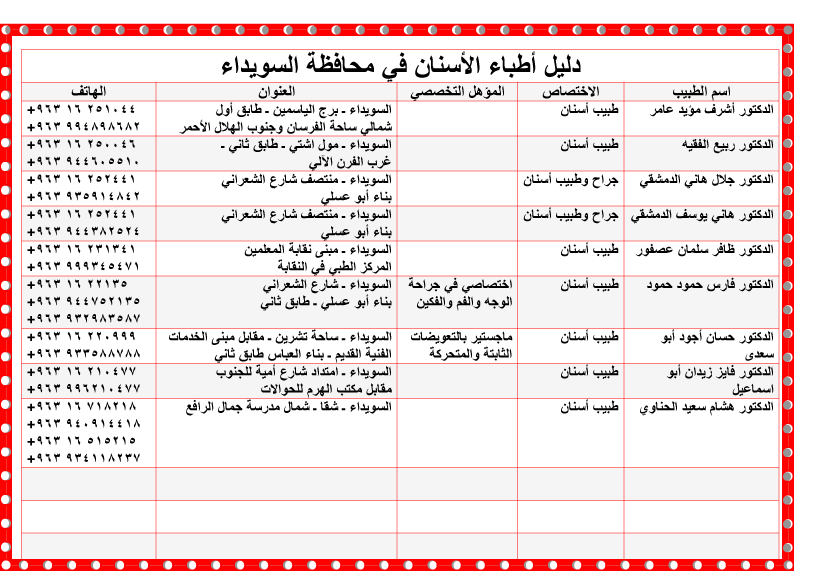 نضع بمتناول أيديكم اليوم أول دليل للمهن الطبية، وهي مهنة طب الأسنان، ليكون معيناً لكم للوصول إلى عيادات أطباء الأسنان في محافظة السويداء، وستجدون في الدليل: اسم الطبيب، واختصاصه العلمي، والعنوان المفصل للعيادة، وأرقام الهواتف، والجوالات للتواصل.