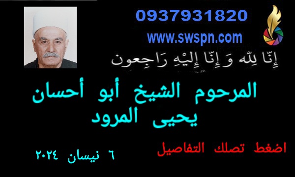 بالرضى والتسليم لقضاء الله وقدره، آل المرود، وأقاربهم في جبل العرب والمهجر، ينعون إليكم وفاة المرحوم الشيخ أبو أحسان يحيى المرود، له الرحمة ولكم من بعده حسن البقاء.