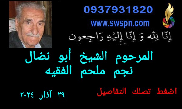 بالرضى والتسليم لقضاء الله وقدره، مديرية السياحة، وغرفة التجارة في السويداء، آل الفقيه وآل أبو الفضل، وأقاربهم في جبل العرب والمهجر، ينعون إليكم وفاة المرحوم الشيخ أبو نضال نجم ملحم الفقيه، له الرحمة ولكم من بعده حسن البقاء.